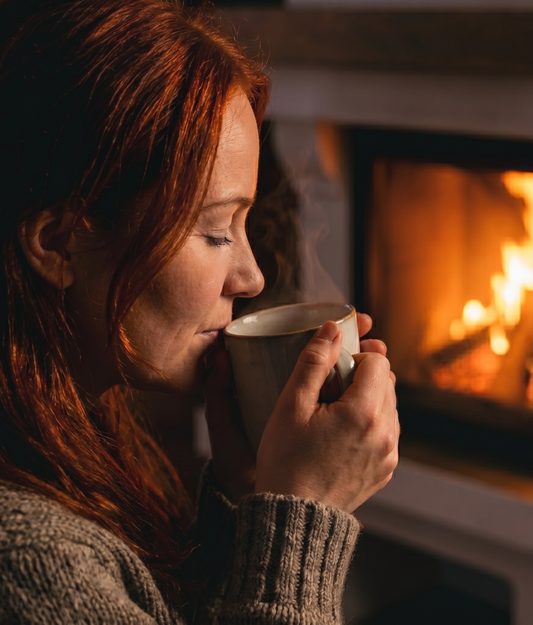 Takkatuli, kynttilät, turkki ja tekstiili, kahvikuppi, ihminen lukemassa sivuprofiilissa. Kevyt sepia-overlay yhtenäistää sävyt (